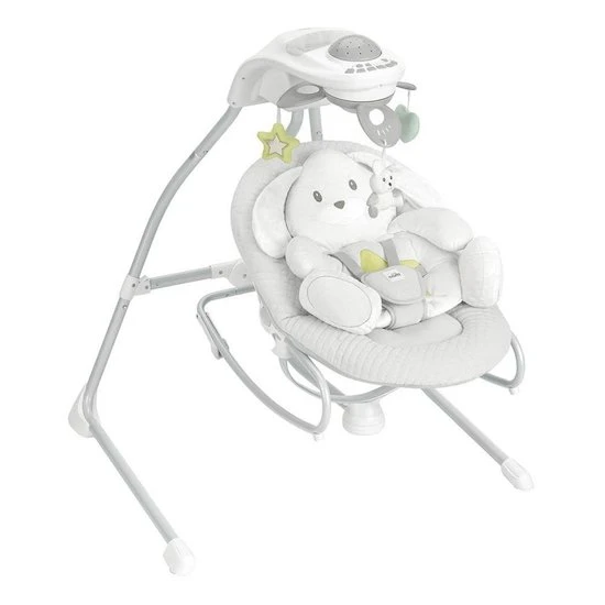 Dossier ajustable sur 2 positions, habillage souple en tissu, réducteur rembourré pour la tête, harnais 5 points, protège-soleil avec 2 peluches amovibles et réglable en hauteur sur 2 positions, 3 vitesses réglables, minuterie d’arrêt automatique (10-20-30 min), 5 mélodies, 3 sons de la nature, volume réglable, pieds avec pastilles en caoutchouc antidérapantes, fonctionnement à piles (4 piles modèle C – 1,5 volts), prévu pour l’utilisation du courant au moyen d’un transformateur en option (IMPUT: 100-240V~50/60Hz 0,25A MAX, OUTPUT: 6V~1000mA). Possibilité d’utilisation comme transat en bloquant la fonction balancelle de l’assise. Habillage déhoussable et lavable à 30°C. Pliage compact. Coffret cadeau.