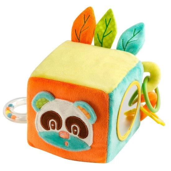 Bébé découvre différents sons et textures en s’amusant avec ce cube multi-activités.