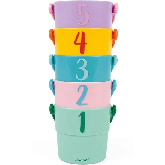 5 seaux d’activités pour jouer dans le bain et à emmener partout ! Remplis tes seaux d’eau ou de mousse et soulève-les le plus haut possible pour regarder l’eau s’écouler grâce aux différents trous.