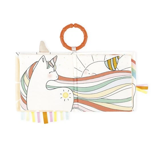 Voyagez au coeur des émotions grâce aux livres tout doux de Kaloo. Chaque livre doudou offre de belles illustrations à regarder, une histoire à raconter, des tissus à caresser et des activités amusantes pour stimuler les sens de bébé et passer de tendres moments ensemble. Découvrez l’histoire d’ une jolie petite licorne qui part trouver le soleil pour s’amuser avec lui. Profiter, jouer et se réjouir voilà la recette qu’offre ce livre pour être joyeux. Inclus : un anneau pour l’accrocher et des rubans à attraper !