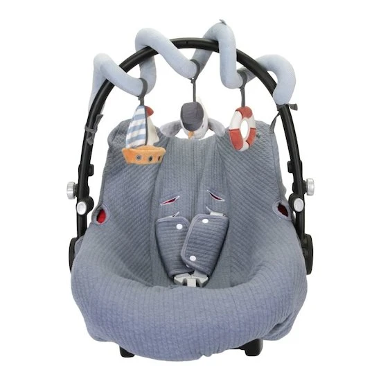 Fabriqué à partir de coton et de velours côtelé, ce jouet sensoriel à toucher et à sentir comprend une mouette suspendue, un voilier, un anneau de vie, une bouée de sauvetage avec diverses étiquettes amusantes et un miroir pour développer la curiosité de bébé. Attachez-le facilement au siège auto et à la poussette.