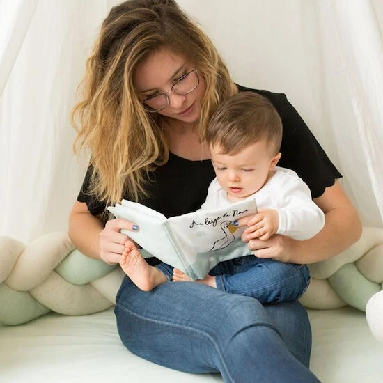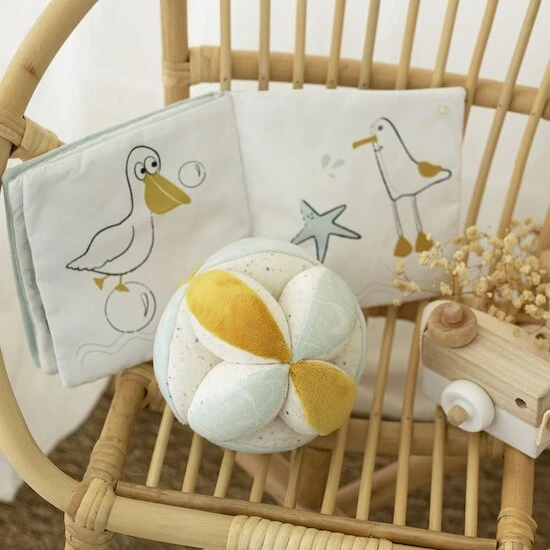 Livre d’éveil en tissu avec ses jolies illustrations des amis de l’océan, en couleur et en noir et blanc ainsi que son miroir pour stimuler la vue de bébé