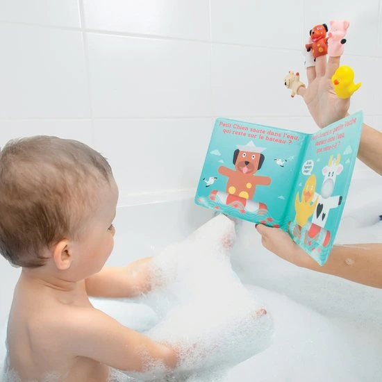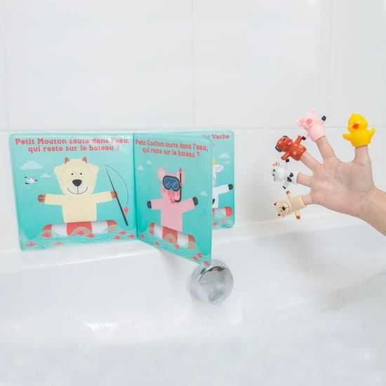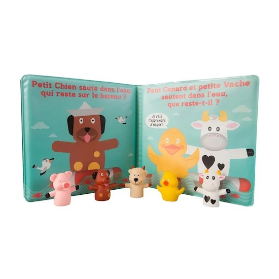 Le livre qui donne vie à ses héros !Le livre « Les petits amis de la ferme sont sur un bateau » illustre l’histoire amusante des animaux qui plongent tour à tour dans l’eau.« Qui reste-t-il ? »Accompagnés des 5 petites marionnettes de doigts, les parents pourront donner vie aux personnages du conte et s’apprêter à inventer d’autres histoires extraordinaires pour continuer le récit. En grandissant, les enfants seront aussi heureux de mettre en action le petit chien farceur, la vache amoureuse, le joyeux cochon, le caneton éducateur et le mouton aventurier !Réalisés en plastique doux, hygiéniques et résistants aux mordillements ainsi qu’à l’eau, les marionnettes comme le livre sont parfaitement adaptés pour les tout-petits. Ce lot offre une belle manière d’animer des moments de complicité entre les enfants et leurs parents. À l’heure du bain ou au couché des petits… il y a toujours une occasion pour un moment de lecture et de découverte !Une très bonne façon d’apprendre à parler tout en s’amusant !Les premiers livres pour enfant favorisent l’éveil, leur imaginaire et leur langage. Les marionnettes permettent aux enfants de développer leur habilité, de reconnaître le nom des animaux puis, quand ils grandissent, de créer leur propre histoire.Adapté pour les enfants de plus de 10 mois.Format du livre : 20 x 20 cm.Composition : 100 % PVC.Égoutter les jouets après utilisation et rincer. Laver à l’eau claire régulièrement.Conforme à la réglementation, toutes les matières en plastique souple sont dépourvues de phtalates.