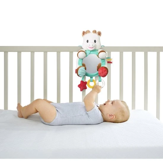 Le miroir d’activités multisupports est idéal pour divertir bébépendant tous ses déplacements !Grâce à ses 2 anneaux, il se fixe facilement à de multisupports(poussette, lit, parc, voiture…). Il peut également être posé sur lesol avec son socle au dos.Amusant, lorsque bébé touche l’étoile une musique se déclenche.Voir son reflet permet aussi à bébé de se familiariser avec sonimage. Pratique, le miroir permet aussi aux parents de toujoursgarder un oeil sur bébé pendant les trajets en voiture.Plusieurs activités stimulant les sens de bébé :un grelot caché dans la patte droitedu papier froissé à l’intérieur de la patte gaucheune puce musicale dans l’étoileun anneau avec un joli son de grelotun anneau de dentition souple et texturé à mordillerdes matières douces et variées (velours côtelé, micro velours,micro polaire…)Lavable en surface.