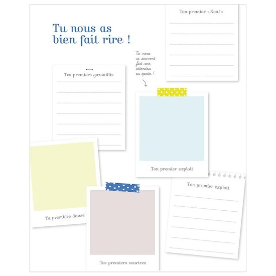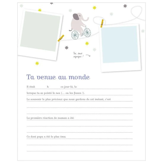 Un album animé (pochettes, toise, carnets, etc.), illustré avec charme et poésie pour consigner ces moments uniques et précieux, de la grossesse aux 3 ans de bébé : premières fois, anecdotes réjouissantes, tendres rituels, photos, dessins…Offert : 1 mobile, plus de 100 stickers, 1 toise.