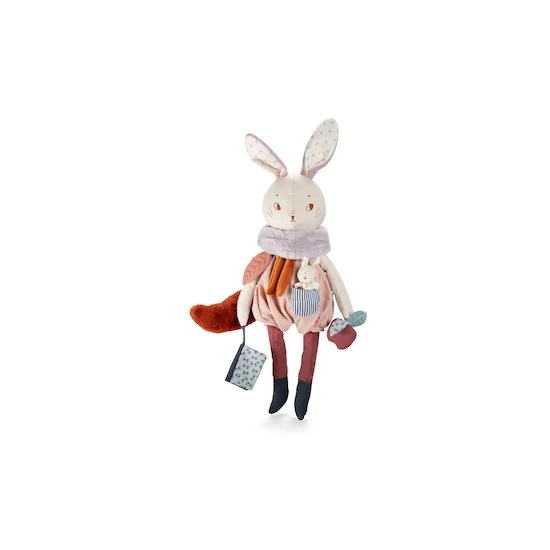 Ce grand lapin d’activités de la collection Après la pluie offre de nombreuses activités pour occuper bébé : Scritch, coucou, pouët, dilling…