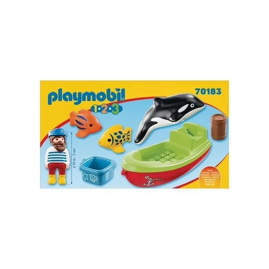 Avec Playmobil 1.2.3, le Bateau et pêcheur, votre enfant imagine et crée ses premières histoires. Le marin à bord de son bateau de pêche observe les poissons et l’orque. Le bateau et les poissons flottent dans l’eau pour devenir des jouets de bain. Et hop ! C’est parti pour l’aventure.