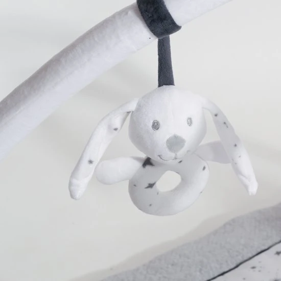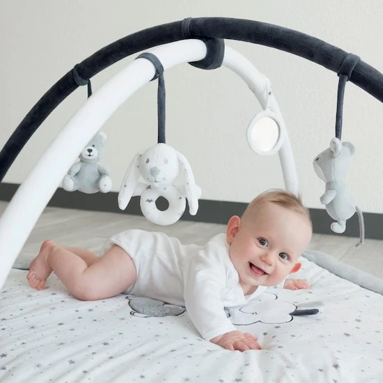 C’est parti pour de chouettes découvertes avec ce joli tapis d’éveil 100×100 cm, bi-matières et multi-activités. Celui-ci offre 20 activités d’éveil comme l’anneau de dentition, le hochet à billes, le miroir, les peluches à pouet, … Les jouets suspendus aux arches sont faciles à saisir pour des petites mains de bébé et stimulent son toucher et la coordination de ses yeux et de ses mains. 2en1 vous pourrez l’utiliser de nombreux mois grâce à son système d’arches amovibles pour le transformer en tapis de parc. Bébé va adorer s’éveiller dessus dès la naissance. La surface de couchage rembourrée est ultra douce et confortable.