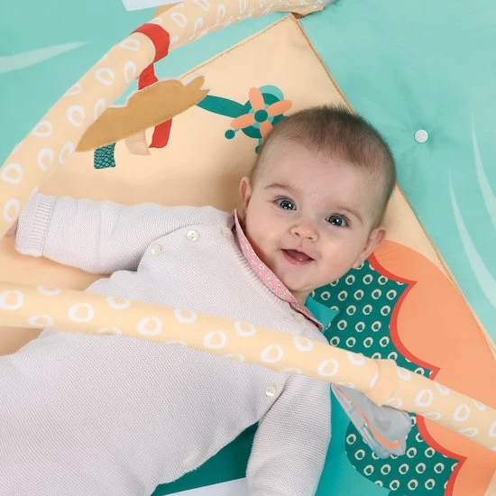On ne perd pas une occasion de s’amuser !L’imagination s’envole avec la jolie montgolfière et ses deux aventuriers ! La magie des voyages aériens opère vite lorsqu’on découvre les avions en papier sur le tapis et les jouets suspendus aux arches. Multicolore, cet espace dédié à l’éveil attire la curiosité de bébé !Tout moelleux et tout doux, le tapis d’éveil permet à bébé de s’amuser et de se reposer confortablement installé, sous le regard de ses parents. Le tapis d’éveil accompagne bébé dans son évolutionIl est idéal pour stimuler la motricité de bébé et développer sa dextérité ainsi que son acuité visuelle, grâce à ses activités sensorielles. Retrouvez 3 jouets amovibles : un raton laveur avec son hochet à billes multicolores, une montgolfière matelassée de papier froissé et un nuage feutré aux multiples textures. Placez les suspensions où vous voulez sur l’arche, cela motivera bébé à tourner la tête. Petit à petit, bébé va développer les muscles du haut du corps, découvrir ses capacités physiques et la position ventrale.Les arches sont amovibles, il suffit d’un clic pour les accrocher ou les retirer afin de créer un espace propice aux moments de complicité !Rabattez les côtés du tapis et liez les par les boutons pressions. Vous formerez un petit cocon sécurisant pour votre bébé. A noter, le tapis prend facilement place dans un parc.Adapté dès 0 mois.Arches amovibles.Dimensions : 110 x 48 x 90 cm.Composé à 100 % de polyester.Lavable en machine à froid.