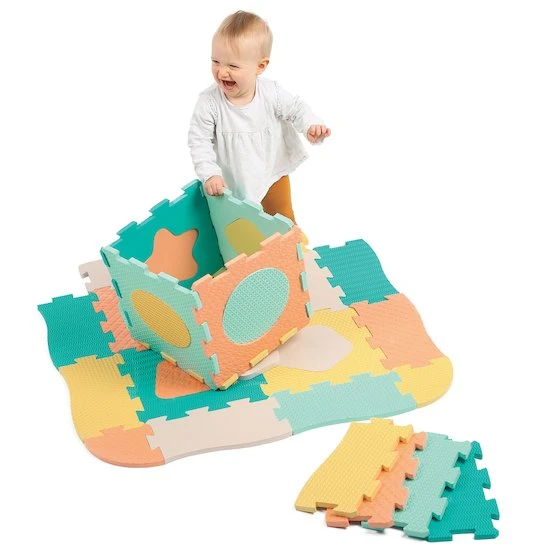 Ludi / 10018 / Dalles géométriques pastel / Âge dès la naissance25 dalles pour former un tapis qui isole bébé du froid et amortit les chocs. Jeu d’encastrement avec les formes. Rebords modulable. Puzzle 2D et 3D ! Hygiénique, utilisation indoor-outdoor.
