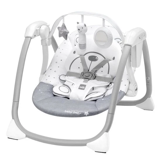 Une balançoire moderne avec une barre de jeu: Informations d’utilisation 0 – 9 kgDescription: Dossier réglable en 2 positions. Revêtement tissu souple. Réducteur rembourré. Harnais à 5 points. Arc parasol avec peluches amovibles et réglable en hauteur dans 3 positions. 5 vitesses réglables. Minuterie d’arrêt automatique. 15 mélodies, 5 sons naturel.Volume réglable. Pieds avec patins antidérapants. Fonctionne à batterie (4 batteries modèle C- 1,5 volts), et avec du courant via un transformateur (INPUT : 100-240V~50/60Hz 0,25A MAX, OUTPUT : 6V~1000ma Revêtement lavable à 30 ° C